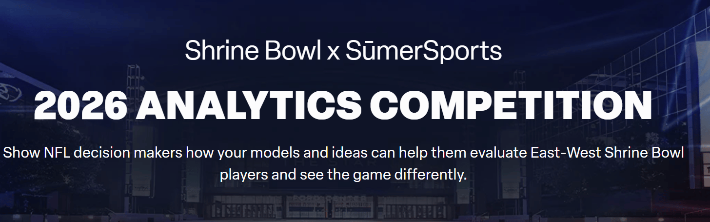 The 2026 Sumer x Shrine Bowl Analytics Competition, similar to the NFL Big Data Bowl, gives you actual football data and industry-relevant challenges to showcase how you think and build analytics that matter to decision makers. Finalists present live during East-West Shrine Bowl week in front of NFL scouts, coaches, and analytics leads, a rare chance to get your work in front of front office eyes.